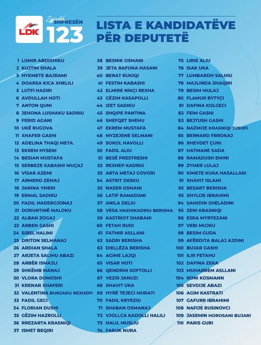 Edhe Lidhja Demokratike e Kosovës (LDK) ka publikuar listën e saj të kandidatëve, e cila udhëhiqet nga kryetari i kësaj partie, Lumir Abdixhiku. Në top-10 gjenden emra të njohur të politikës dhe akademisë, si Kujtim Shala, Hykmete Bajrami, Doarsa Kica-Xhelili, Lutfi Haziri, Avdullah Hoti, Anton Quni, Jehona Lushaku Sadriu, Ferid Agani dhe Ukë Rugova.