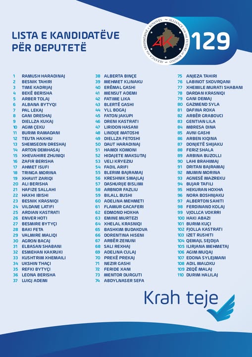 AAK garon me listë të kryesuar nga Ramush Haradinaj, ndërsa në dhjetëshen e parë përfshihen emra si Besnik Tahiri, Time Kadrijaj, Bekë Berisha, Arber Tolaj, Albania Bytyqi, Pal Lekaj, Gani Dreshaj dhe Agim Çeku.