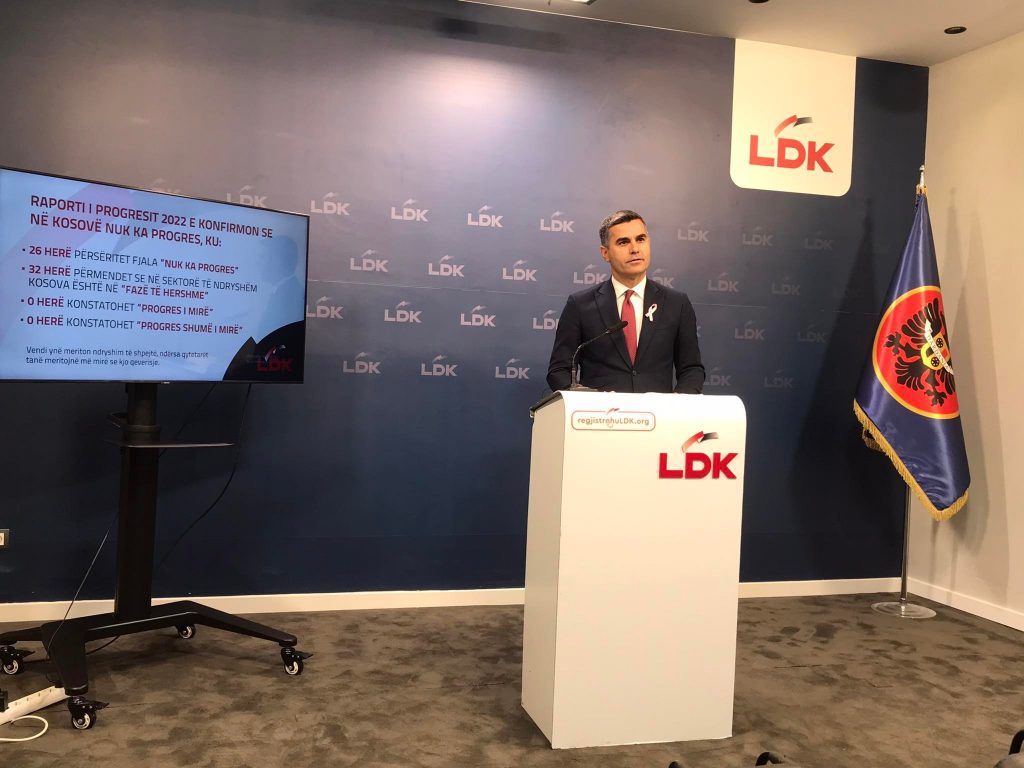 “Komisioni Evropian përmes Raportit të progresit 2022 e konfirmoi se në Kosovë nuk ka progres në fushat kyçe të vlerësimit për procesin e integrimit evropian të Kosovës. Ky raport e konfirmon atë që LDK-ja e ka thënë vazhdimisht. Në Kosovë nuk ka progres, në fushat kyçe, pra nuk ka zhvillim në sektorë të ndryshëm, të ekonomisë, shëndetësisë, në drejtësi e në siguri. Në asnjë fushë të vlerësimit për Kosovën për fat të keq Komisioni Evropian nuk konstaton se ka progres të mirë… Më e rëndësishmja është dështimi i madh në shëndetësi. Raporti për Kosovën e konfirmon situatën e rëndë për qytetarët e Kosovës në sektorin e shëndetësisë”, tha ai.