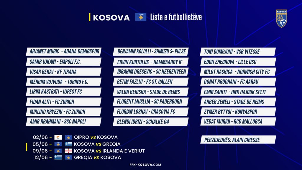 Përzgjedhësi i Përfaqësueses së Kosovës, Alain Giresse, e ka bërë publike listën e futbollistëve që do t’i ketë në dispozicion për katër ndeshjet e muajit qershor në edicionin e ri të Ligës së Kombeve.