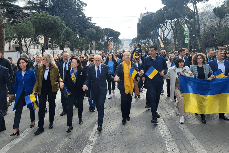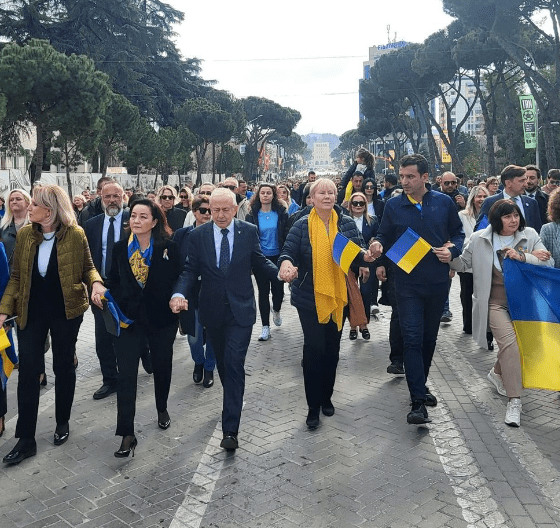 Qytetarët, ambasadorët dhe eksponentët e lartë shtetetërorë, marshuan duke ia mbajtur dorën njëri-tjetrit që nga ambasada e Ukrainës në Tiranë deri në sheshin Skënderbej.