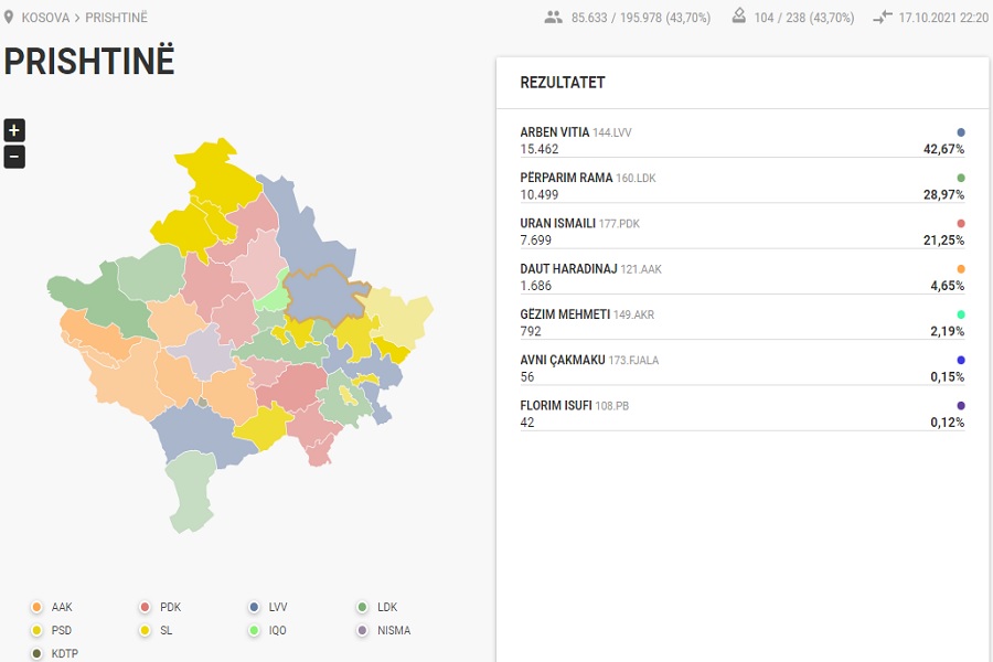 Betim GashiKomisioni Qendror i Zgjedhjeve (KQZ) ka numëruar 43.70 për qind të votave në kryeqytet. Rezultatet preliminare tregojnë për një epërsi për Arben Vitinë e Lëvizjes Vetëvendosje me 42.67 për qind ose 15462 vota.