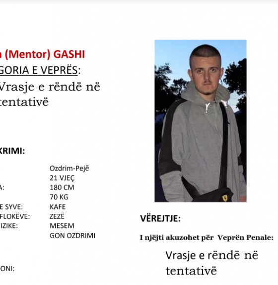 Betim GashiËshtë arrestuar 21-vjeçari Agron Gashi, i dyshuar për plagosjen e trefishtë mbrëmë në Pejë.