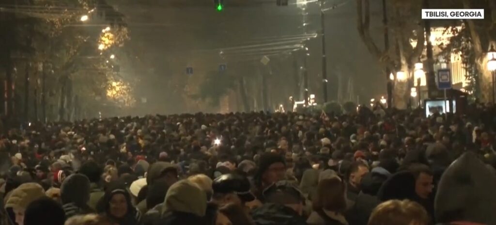 Mijëra njerëz kanë protestuar në Tbilisi kundër pezullimit të bisedimeve të pranimit në BE. Policia ka përdorur ujë dhe gaz lotsjellës, ndërsa ka pasur dhunë edhe ndaj gazetarëve.