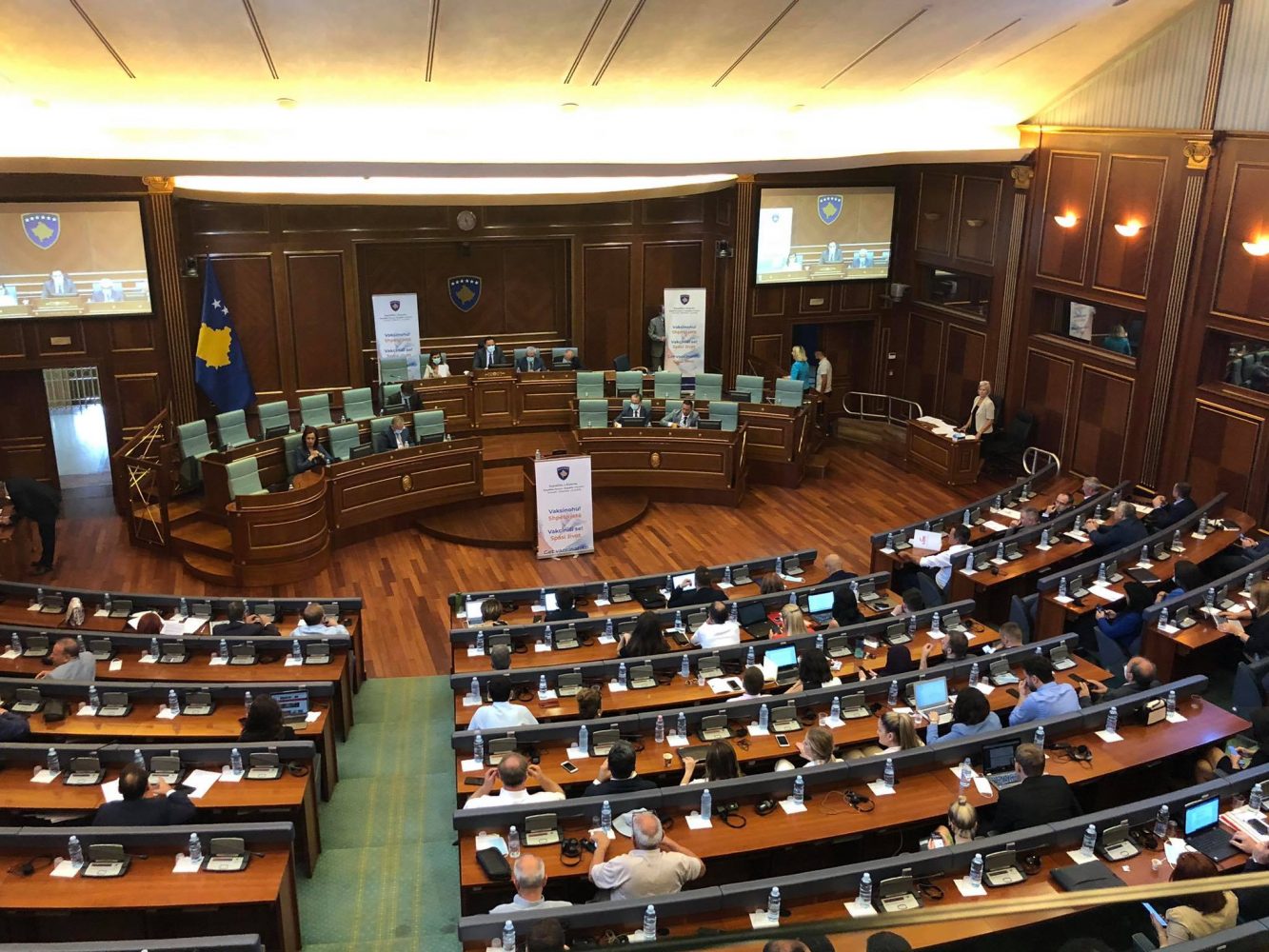 Në sallën e seancave plenare është vendosur edhe një baner me mbishkrimin “Vaksinohu, shpëto jetë”.