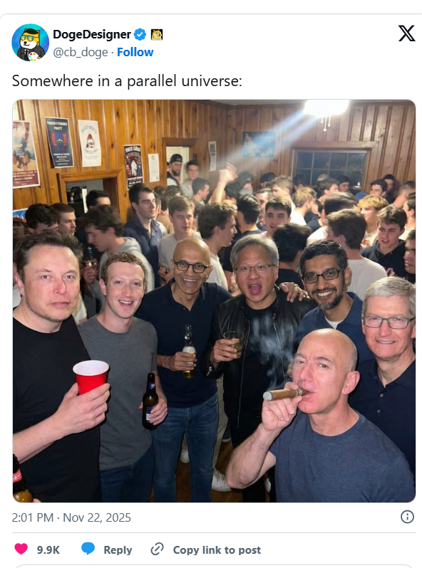 Një tjetër imazh viral tregon të njëjtin grup drejtuesish të teknologjisë në një dhomë të përbashkët, me mbishkrimin: “Vetëm një takim relaksues me shokët”.