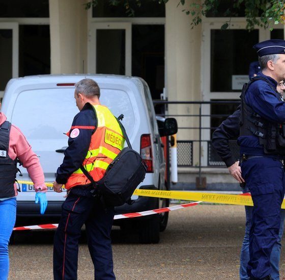 Dëshmitarët thonë se vrasësi me thikë bërtiti “Allahu Akbar”, ose “Zoti është më i madhi”, gjatë sulmit në një shkollë në Arras të Francës veriore. Ai tani është në paraburgim.