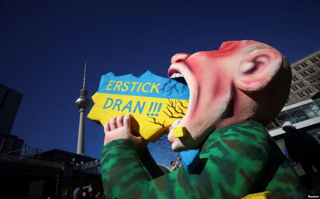 Foto: Reuters/Një objekt i punuar nga artisti Jacques Tilly, që ngjan në presidentin rus, Vladimir Putin, shihet në protestat në Berlin. Afër tij shihet një mbishkrim me ngjyra të Ukrainës kinse po e ha Putini. Në të thuhet: Mbytu në të!