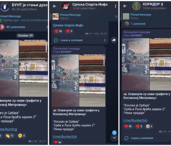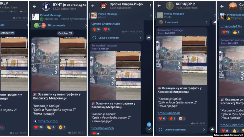 Kështu, më 29 tetor, kanali “Bunker” në Telegram njoftoi se në Mitrovicë të Veriut janë shfaqur grafite të reja: “Kosova është Serbi”, “Serbët dhe rusët janë vëllezër përgjithmonë Z”, “Nuk ka dorëzim”.