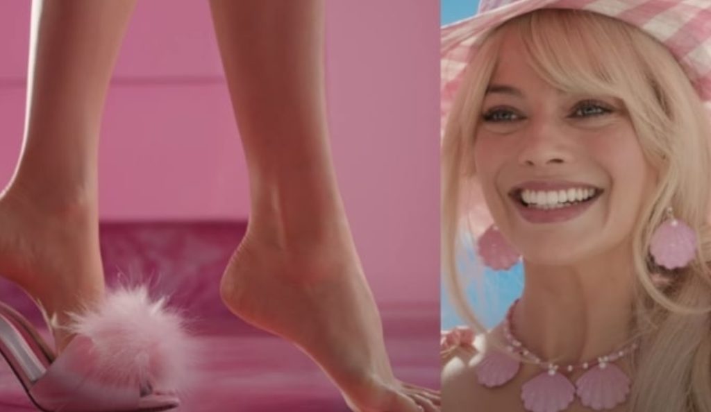 Pamja tregon këmbët e aktores 33-vjeçare duke ecur në një pistë rozë të ndezur me taka të larta me xixëllim dhe gëzof. Regjisorja Greta Gerwig në mënyrë specifike refuzoi të bënte CGI (imazhe të krijuara nga kompjuteri) skenën e këmbës, duke thënë se do të ishte një “makth”.