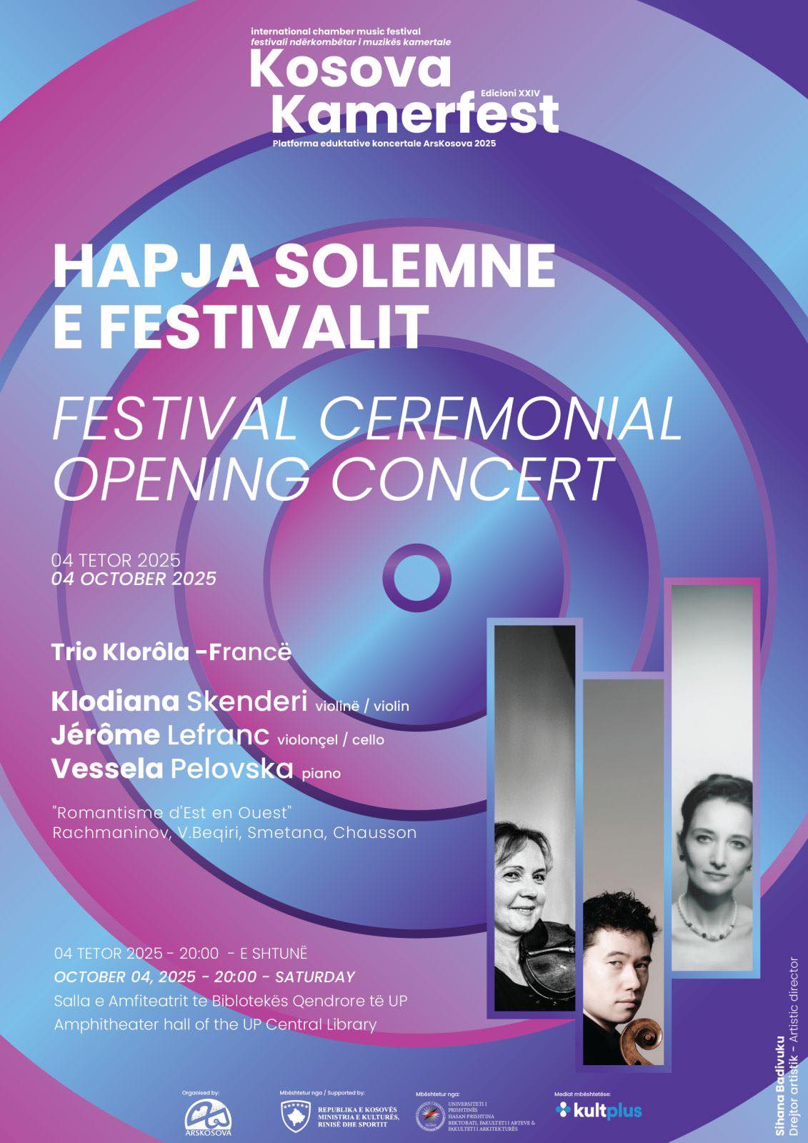 “Klodiana Skenderi, violinistja shqiptare që jeton dhe vepron në Paris, rikthehet në Prishtinë pas plot 44 vitesh. Për herë të fundit ajo ishte ngjitur në skenën kosovare në fillim të viteve ’80, kur si vetëm 9-vjeçare mahniti publikun me virtuozitetin e saj. Atëherë interpretoi me mjeshtëri koncertin e Mendelssohn-it për violinë dhe orkestër, si dhe një recital violinë-piano në sallën e Radio Prishtinës – një paraqitje që mbeti gjatë në kujtesën e artdashësve. Kësaj radhe, ajo kthehet me dy kolegët e saj ndërkombëtarë për të sjellë disa nga kryeveprat e literaturës për piano trio (Rachmaninov, Smetana, Chausson), si dhe premierën botërore të veprës së kompozitorit kosovar Valton Beqiri – “Folk Suite” për piano trio (Jugu – Arbëreshë – Veriu – Kosova)”, thuhet në njoftimin e festivalit.