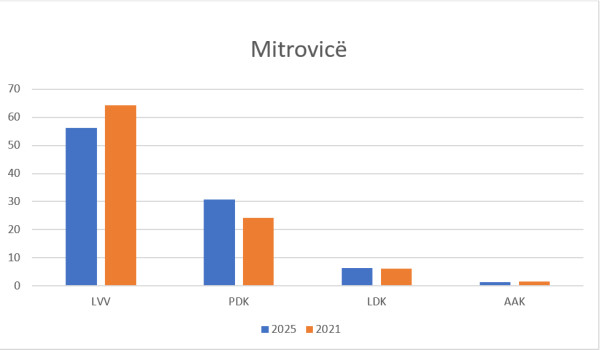 Partia Demokratike e Kosovës në rezultatet preliminare në Mitrovicë ka arritur ti marr 30.70 për qind, ndërsa në rezultatet përfundimtare në zgjedhjet parlamentare të vitit 2021 kishte arritur t’i marr 24.19 për qind.