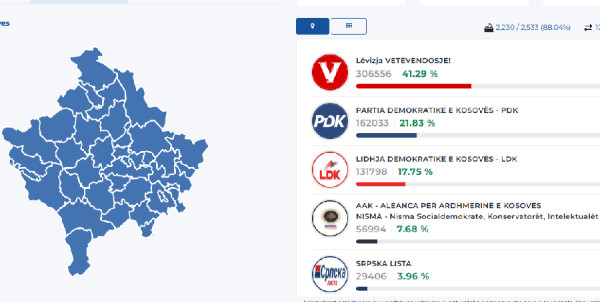 UBTnewsKomisioni Qendror i Zgjedheve ka dal me statistika të reja në orën 6:04 minuta. Sipas këtyre të dhënave, Lëvizja Vetëvendosje prin me rezultat 41.29 për qind, pasuar nga Partia Demokratike e Kosovës me 21.83 për qind. Në radhë është Lidhja Demokratike me 17.75 për qind, e katërta me radhë është Aleanca për Ardhmërinë e Kosovës me 7.68 për qind.