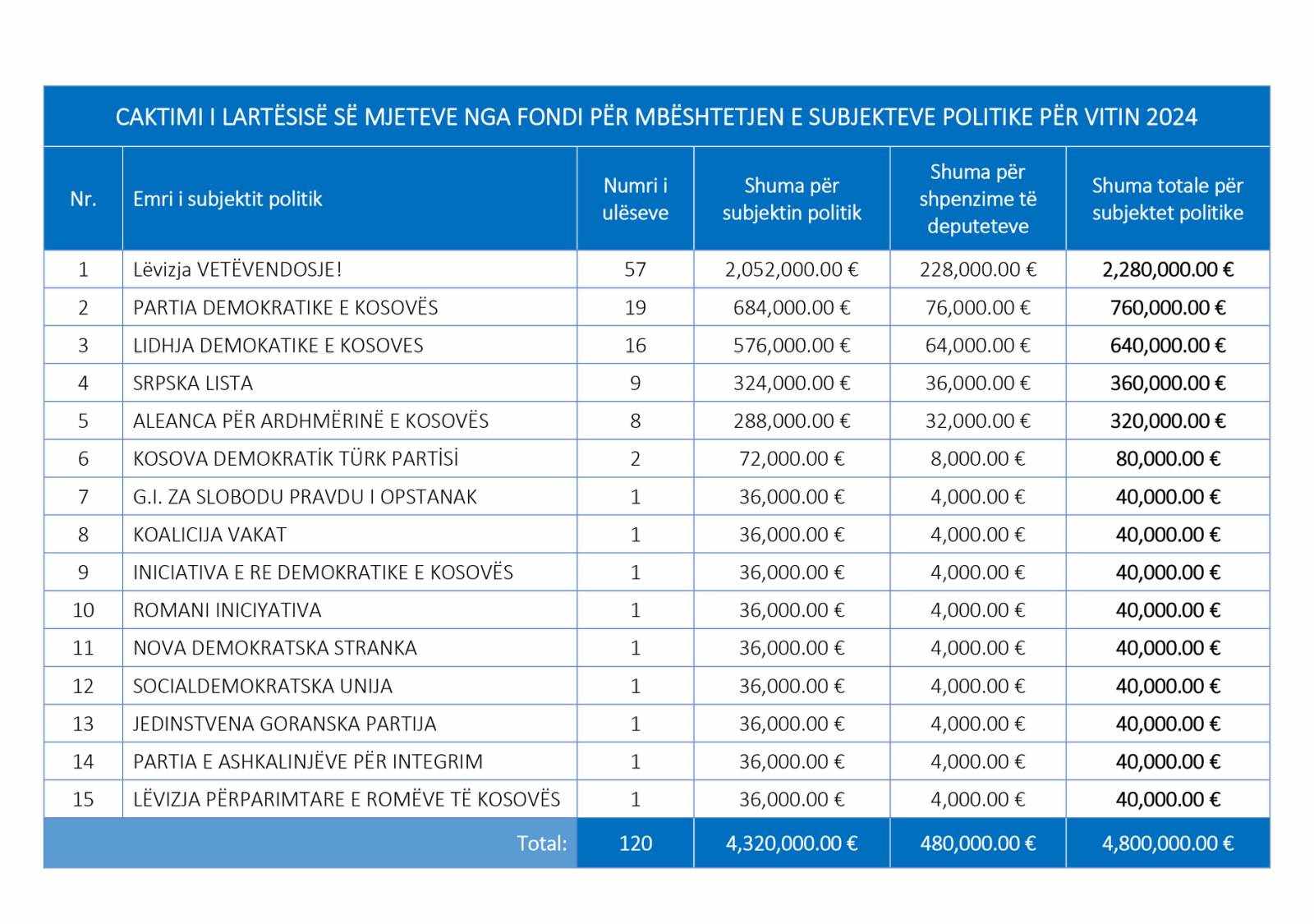 Nga kjo shumë, subjektit më të madh politik në vend, Vetëvendosjes iu kanë ndarë 2 milionë e 280 mijë euro, PDK-së 760 mijë euro, LDK-së 640 mijë euro, Listës Serbe 360 mijë euro dhe AAK 320 mijë.