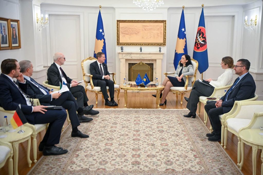 Presidentja e Kosovës, Vjosa Osmani, priti sot në takim shefin e Zyrës së BE-së në Kosovë, Tomas Szunyog, ambasadorin e Francës në Kosovë, Olivier Guérot, ambasadorin e Italisë, Antonello De Riu dhe zv.ambasadorin e Gjermanisë, Mathias Conrad me të cilët u diskutuan zhvillimet aktuale në fushën e politikës dhe atë të sigurisë.
