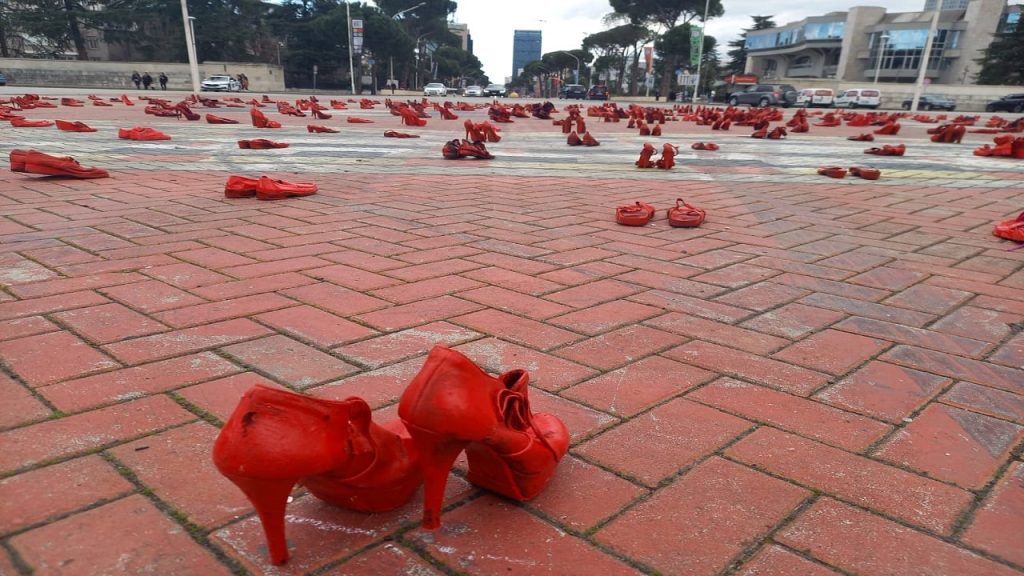 Dita Ndërkombëtare e Gruas po festohet dhe protestohet në Tiranë. Në sheshin “Nënë Tereza” në Tiranë është vendosur instalacioni “Këpucët e kuqe”.