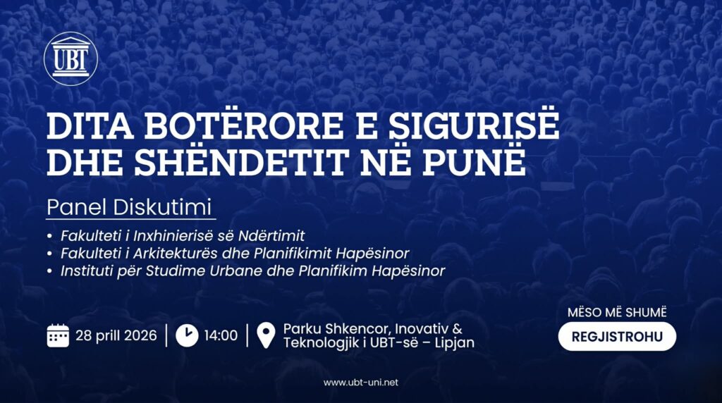 Me rastin e Ditës Botërore të Sigurisë dhe Shëndetit në Punë, UBT do të jetë nikoqir i një diskutimi që prek një prej sektorëve më dinamikë në vend: ndërtimin. Ngjarja do të mbahet nesër, më 28 prill 2026, duke filluar nga ora 14:00, në ambientet e Bibliotekës në Parkun Shkencor, Inovativ dhe Teknologjik të UBT-së, në Lipjan.