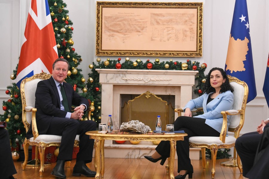 Presidentja e Republikës së Kosovës, Vjosa Osmani sot (e enjte) ka pritur në takim ministrin e Jashtëm të Britanisë së Madhe, David Cameron. Mediat janë lejuar të marrin pamje në fillim të takimit.