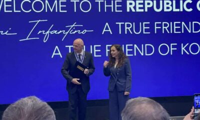 “I dashur President Infantino, ne do ta kujtojmë gjithmonë që ju qëndruat pranë nesh gjatë këtyre momenteve historike dhe gjatë kësaj kohe vendimtare përmes anëtarësimit në UEFA si dhe në FIFA. Ju besuat në ne, besuat në potencialin e Kosovës dhe në fuqinë bashkuese të sportit, në një kohë kur të besoje kërkonte ende guxim. Ju e kuptuat se futbolli, në thelb, është për njerëzimin, për t’i dhënë çdo fëmije, pavarësisht nga vjen, mundësinë për të përkitur, për të përkitur”, tha Osmani.