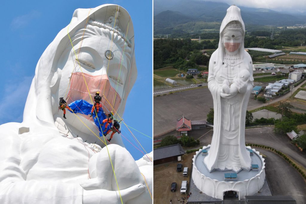 Një statujë budiste, 57 metra e lartë, kushtuar Hyjneshës së Mëshirës – Kannon, në Japoninë qendrore, është mbështjellë me një maskë kundër COVID-19.