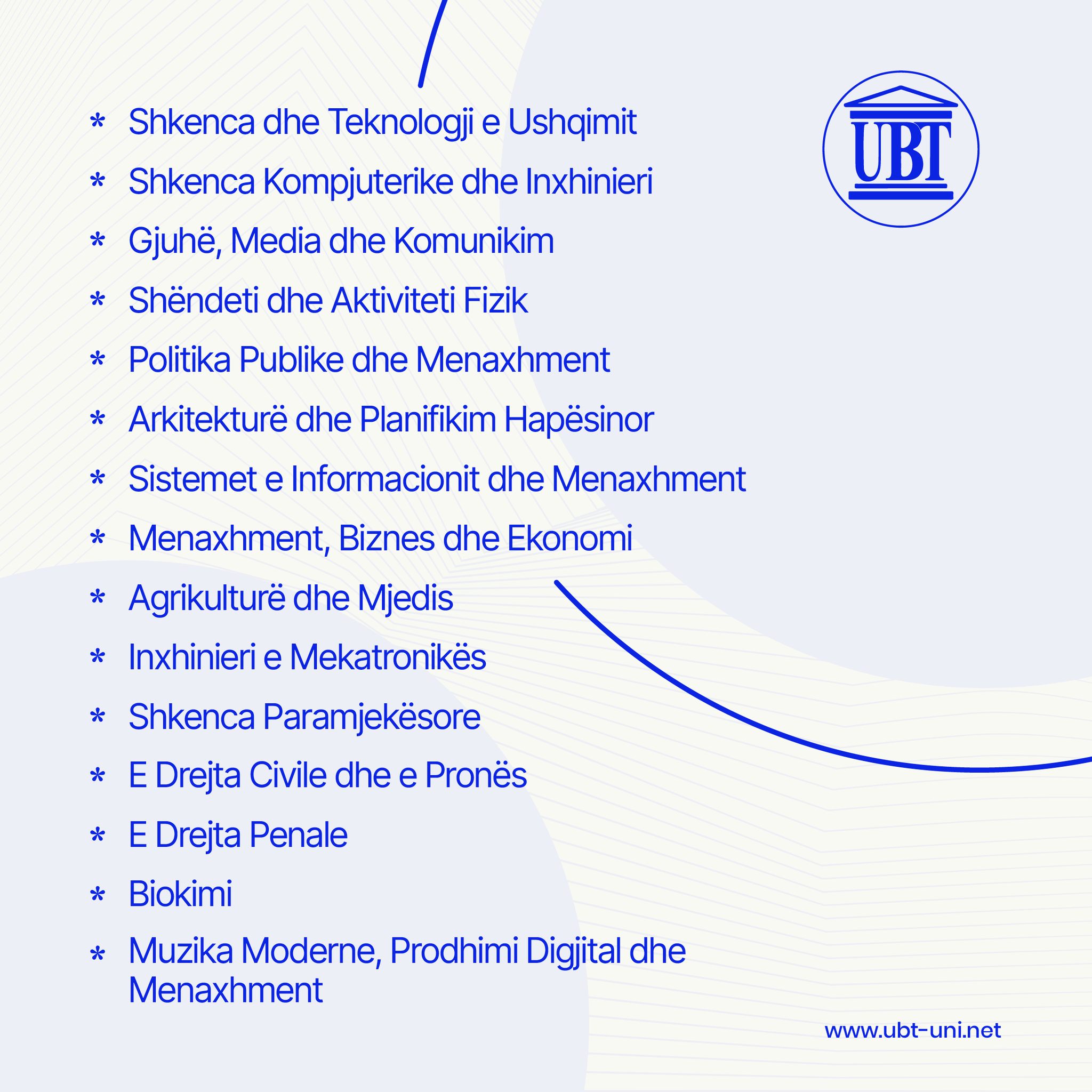 Të gjithë ata që janë të interesuar për të avancuar karrierën e tyre dhe për të fituar njohuri të reja, janë të inkurajuar të aplikojnë. Regjistrimet po vazhdojnë, kështu që mos e humbni këtë mundësi për të ndjekur një arsim të lartë cilësor në UBT!