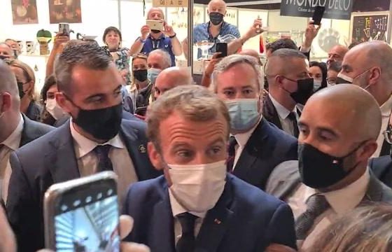 Presidenti francez, Emmanuel Macron është goditur me vezë gjatë një eventi në Lion, të hënën. Veza goditi supin e Macronit, por nuk u thye.