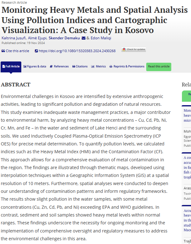 Profesori i UBT-së, Edon Maliqi, është bashkëautor i një studimi shkencor të rëndësishëm, i cili është botuar së fundmi në revistën ndërkombëtare Environmental Monitoring and Assessment. Titulli i punimit është “Monitoring Heavy Metals and Spatial Analysis Using Pollution Indices and Cartographic Visualization: A Case Study in Kosovo”, dhe është realizuar në bashkëpunim me Kaltrina Jusufin, Almë Ejupin dhe Skender Demakun.