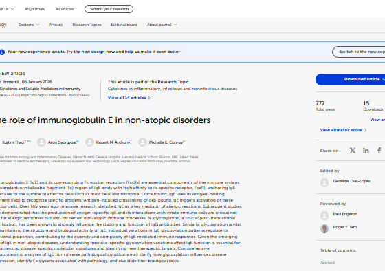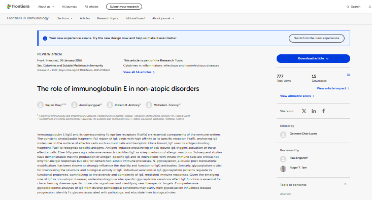 Në këtë artikull shkencor, autorët theksojnë se funksioni i IgE-së dhe efekti i saj sinjalizues përmes receptorëve FcεR shtrihet përtej sëmundjeve klasike atopike, duke luajtur rol të rëndësishëm edhe në shumë mjedise inflamatore jo-atopike dhe në sëmundjet e ndërmjetësuara nga imuniteti. Një fokus i veçantë i studimit është ndryshimi i glikozilimit në vende specifike të molekulës së IgE-së, ndryshime që mund të ndihmojnë në karakterizimin molekular të sëmundjeve, në stratifikimin e pacientëve dhe në identifikimin e mundësive të reja terapeutike.