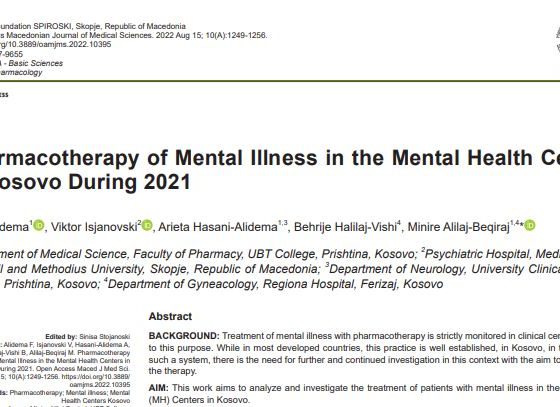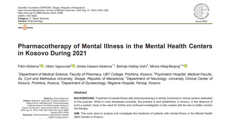 Betim GashiPunimi i profesorëve të Shkencave Mjekësore në UBT, prof. Dr. Fitim Alidema, PhD kandidat Arieta Hasani-Alidema, Prof. Dr. Minire Alilaj-Beqiraj, në bashkëpunim me disa profesorë nga universitete të tjera, me titull: “Pharmacotherapy of Mental Ilines the Mental Health Centers in Kosovo During 2021”, është publikuar në revistën shkencore “Open Acces Macedonian Journal of Medical Sciences”, e cila është e indeksuar në platformën Scopus.