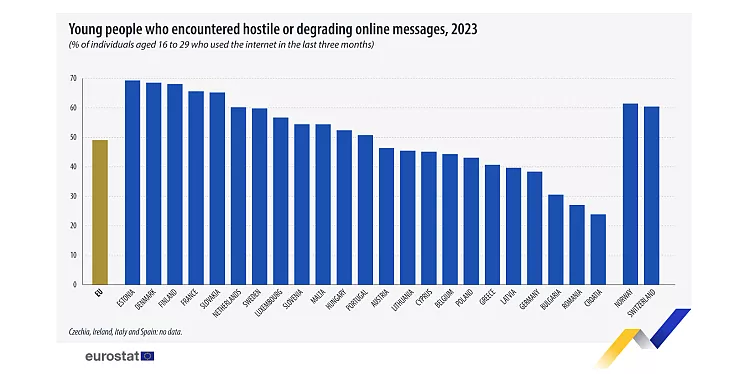 Një raport i ri nga Eurostat ka zbuluar se të rinjtë në Bashkimin Evropian mbeten shumë të cenueshëm ndaj urrejtjes dhe abuzimit në internet. Sipas të dhënave të vitit 2023, gati gjysma e popullsisë të BE-së, në moshën 16 deri 29 vjeç, janë përballur me mesazhe armiqësore në internet të cilat ishin të orientuara kundër grupeve apo individëve të caktuar.