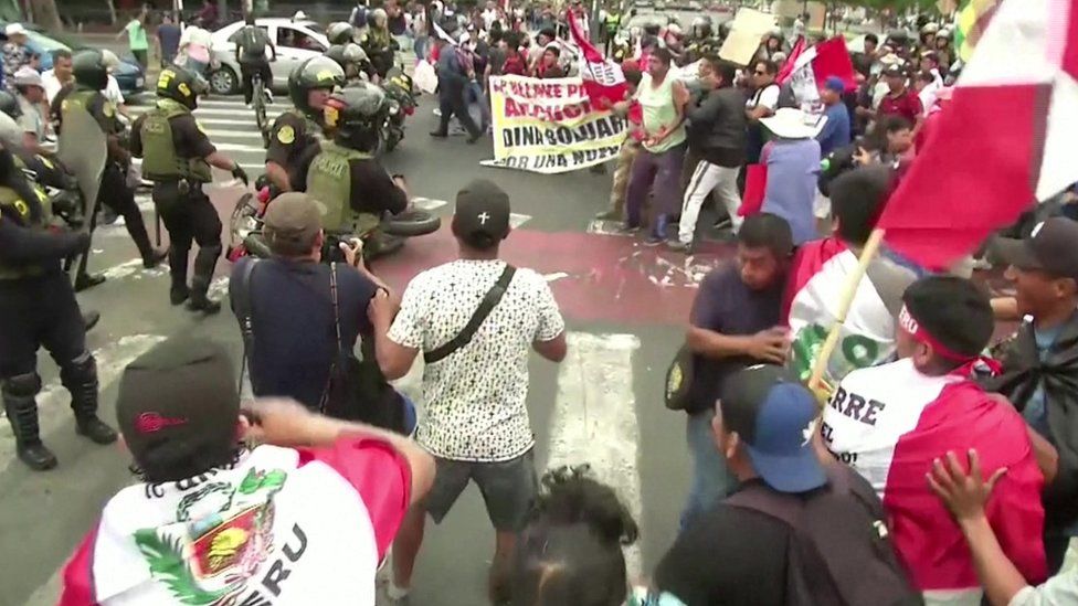 Policia përdori gazlotsjellës për të shpërndarë turmat në kryeqytetin Lima, ku mijëra protestues nga zonat rurale po qëndrojnë.