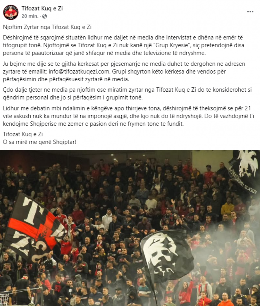 Vetë “Tifozët Kuq e Zi”, kanë reaguar nëpërmjet një postimi në rrjetet sociale, duke shkruar se askush nuk mundet dot të imponojë asgjë dhe se do të vazhdojnë t’i këndojnë Shqipërisë me zemër e pasion. “Tifozat Kuq e Zi” kanë theksuar se askush nuk mund të imponojë asgjë mbi ta dhe se do të vazhdojnë t’i këndojnë Shqipërisë me zemër e pasion.