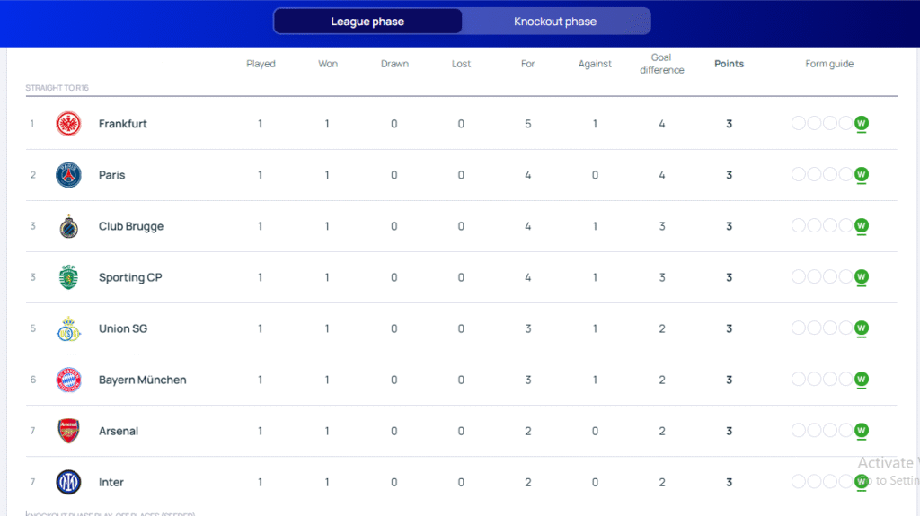 Në krye të tabelës ndodhet Eintracht Frankfurt që ndan vendin e parë me Paris Saint-Germain, i cili gjithashtu nisi në mënyrën më të mirë të mundshme.