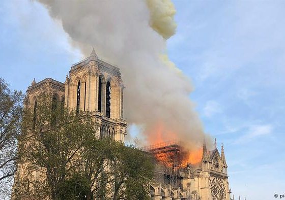Zjarri që ra dy vjet më parë tmerroi Francën dhe gjithë botën. Mijëra kureshtarë ishin grumbulluar atë mbrëmje rreth kësaj trashëgimie botërore të UNESCO-s, duke ndjekur me thirrje tmerri se si shëmbej maja e kambanares nga zjarri. Edhe pjesë të tëra të konstruksionit mesjetar të kulmit të çatisë u dogjën, qemerët e kalimeve kryesore anësore pësuan dëmtime. Ekipet televizive nga e gjithë bota ditë me rradhë zunë vend përreth katedrales, nga ku raportonin drejtpërdrejt, edhe kur Macron u zotua se do ta rindërtonte monumentin brenda pesë vitesh. Fillimisht ai u shpreh se dëshironte një rindërtim bashkëkohor të majave të kambanareve, por në fund iu nënshtrua ekspertëve, të cilët kërkonin një rindërtim sipas Viollet-le-Duc. Menjëherë pas zjarrit sipërmarrje të mëdha dhe donatorë të vegjël premtuan gati një miliard euro donacione për rindërtimin. Administratorët e katedrales kanë mbledhur tanimë 833 milion euro dhe kanë marrë të paktën premtime ligjërisht të detyrueshme për 98 për qind.