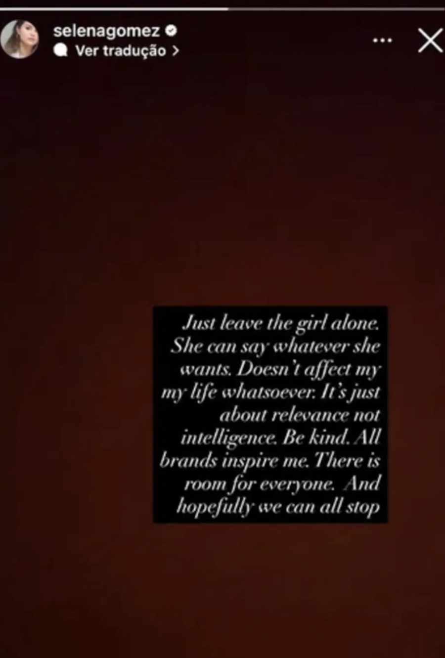 Në një Story të mëvonshëm, këngëtarja dhe aktorja e “Only Murders in the Building” shkroi: “Thjesht lëreni vajzën rehat! Ajo (Hailey) mund të thotë çfarë të dojë. Nuk ndikon aspak. Është çështje rëndësie, jo inteligjence! Jini të sjellshëm! Të gjitha markat më frymëzojnë.”