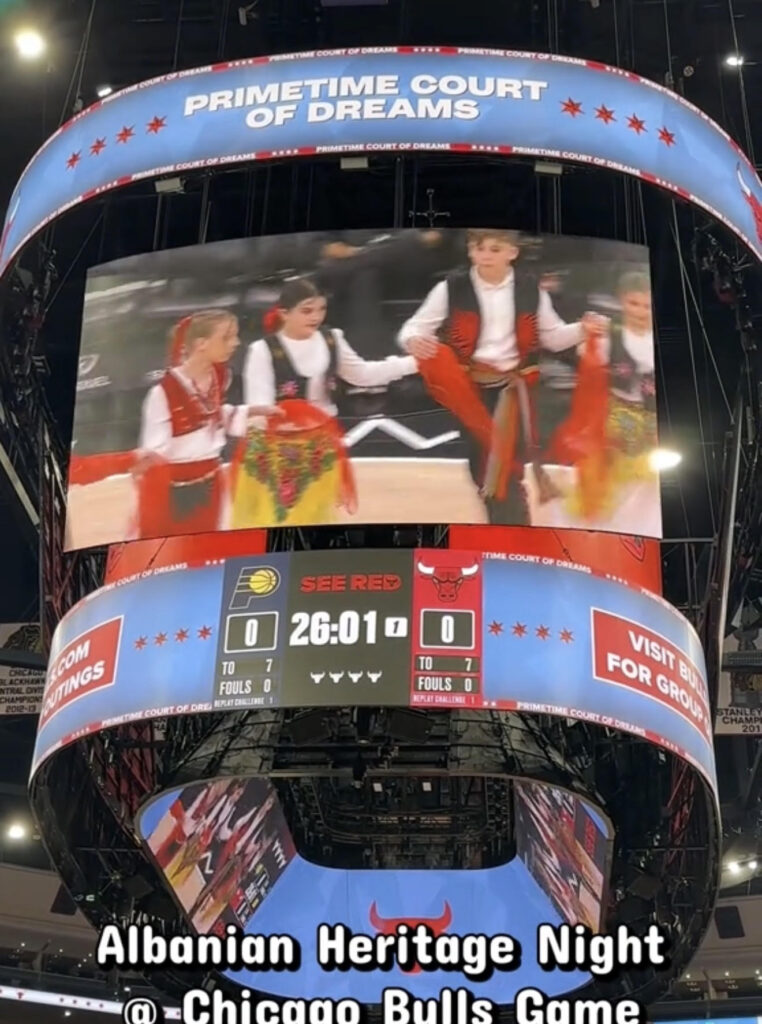 Para përballjes mes Chicago Bulls dhe Phoenix Suns në United Center, ansambli i komunitetit shqiptar në Illinois dhuroi një performancë mbresëlënëse me këngë dhe valle tradicionale.