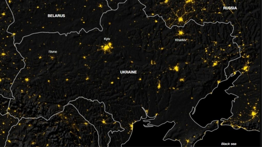 Para se në vend të mbërrinin forcat ruse, që hynë për herë të parë më 24 shkurt, pamjet satelitore natën nga Ukraina tregonin qiellin e shndritshëm në Kiev, Kharkiv, Rivne dhe zona të tjera urbane. Tashmë, të njëjtat plane tregojnë një vend që është zhytur në errësirë, duke u strukur para një sulmi brutal të Rusisë.