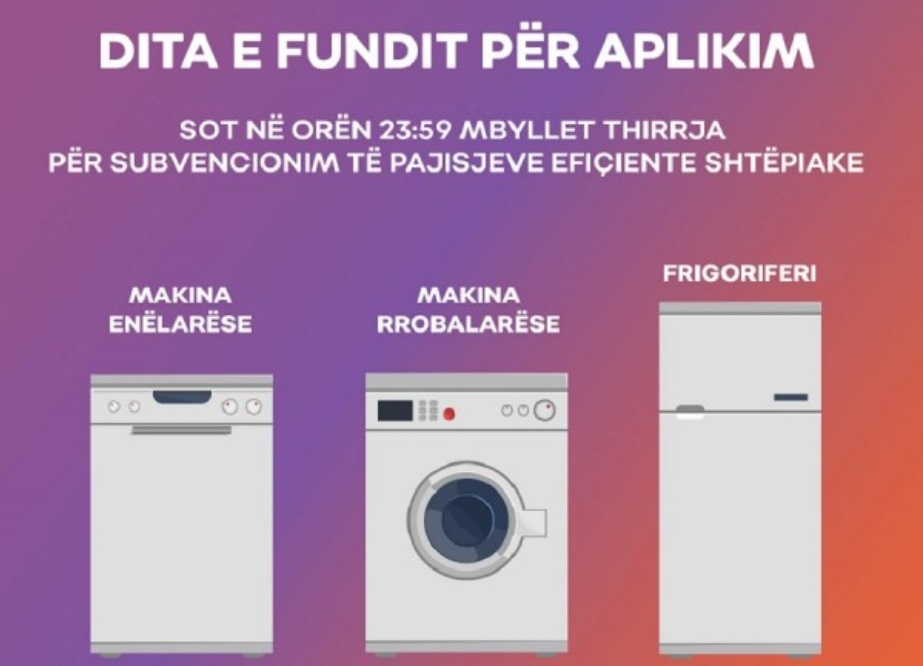 Ministria e Ekonomisë njofton se sot (e hënë), në orën 23:59, përfundon afati i aplikimit për subvencionimin e pajisjeve efiçiente shtëpiake me mbështetje nga Komisioni Evropian.