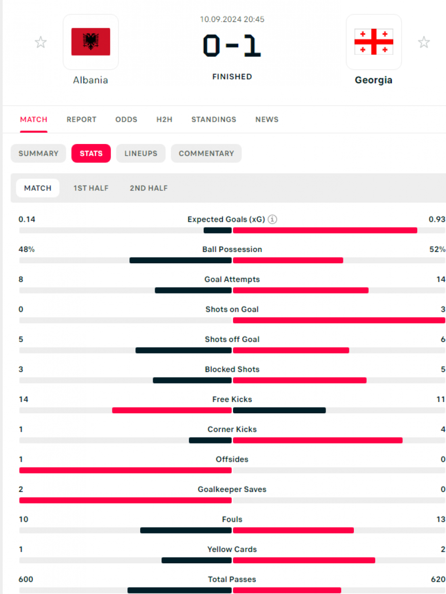 Në “Air Albania” u luajt ndeshja e dytë e Grupit B1 të Ligës së Kombeve mes Shqipërisë dhe Gjeorgjisë. Gjeorgjia fitoi 1-0, duke marrë kreun e grupit me pikë të plota, ndërsa skuadra e Silvinjos pëson humbjen e parë, pas suksesit të arritur ndaj Ukrainës (2-1).
