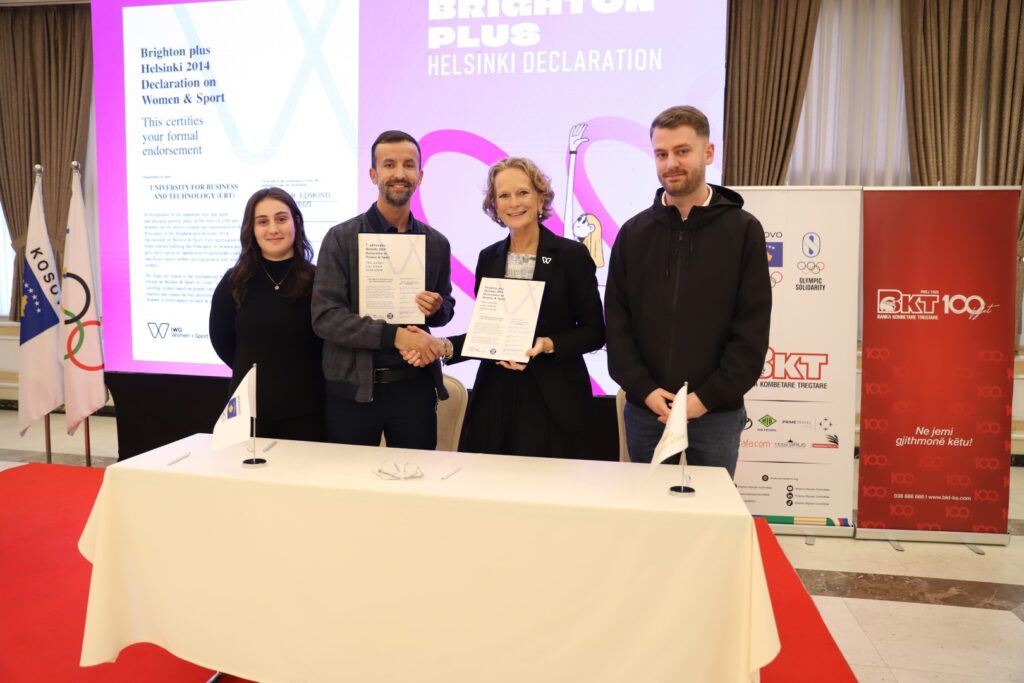 Me qëllim të promovimit dhe fuqizimit të rolit të gruas brenda dhe jashtë fushës sportive, UBT ka nënshkruar Deklaratën ndërkombëtare “Brighton Plus Helsinki”, një dokument i rëndësishëm që synon të avancojë barazinë gjinore në sport dhe të sigurojë përfshirjen e plotë të grave dhe vajzave në të gjitha nivelet e veprimtarisë sportive.