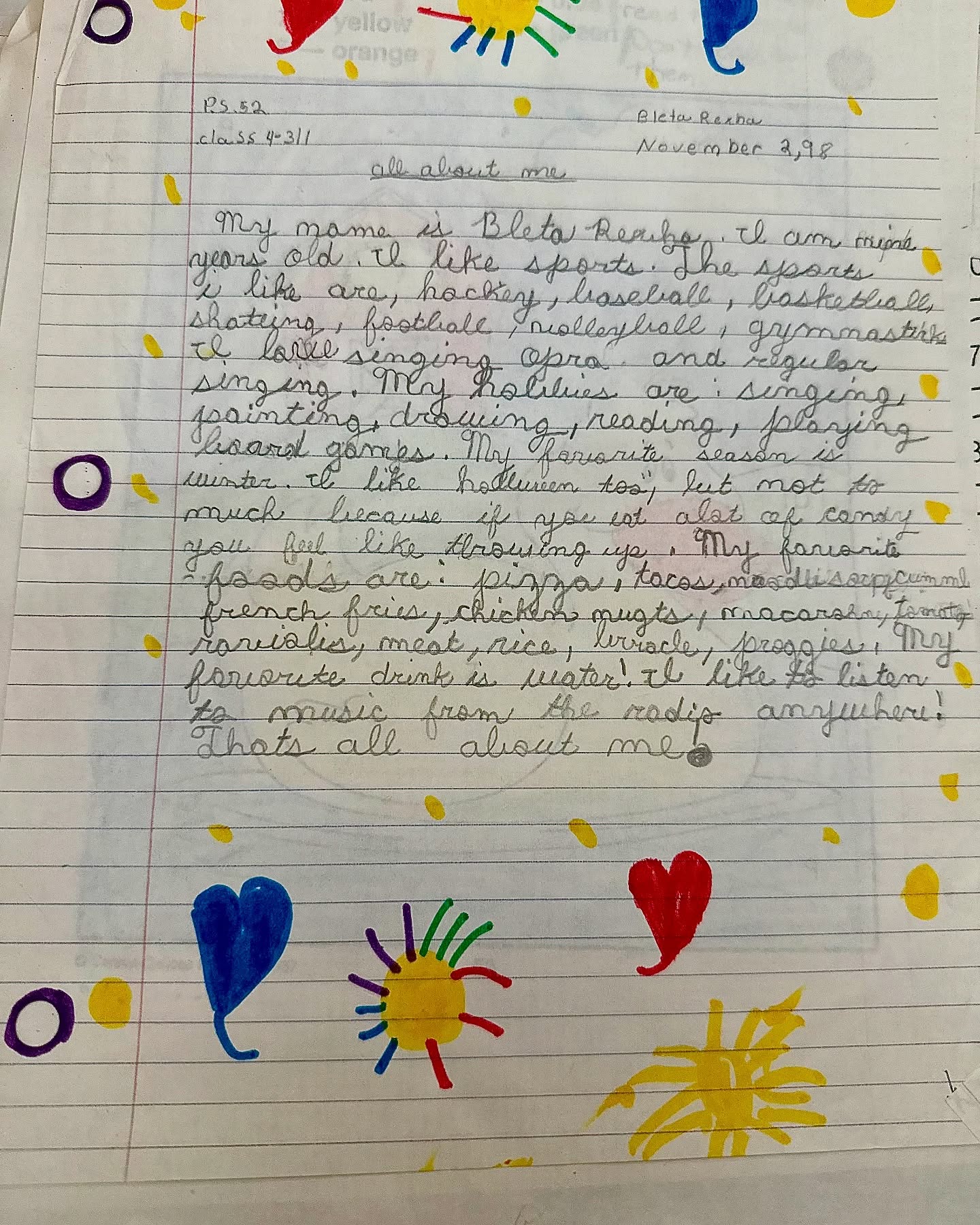 “Emri im është Bleta Rexha. Jam nëntë vjeçe. Më pëlqejnë sportet. Sportet që më pëlqejnë janë hokej, bejsboll, basketboll, patinazh, futboll, volejboll, gjimnastikë. Më pëlqen të këndoj opera dhe këngë pop. Hobet e mia janë këndimi, pikturimi, vizatimi, leximi dhe luajtja e lojërave me letra. Sezoni im i preferuar është dimri. Më pëlqen Halloween-i, por jo shumë, sepse nëse ha shumë karamele, ndihesh keq. Ushqimet e mia të preferuara janë pizza, tacos, pure patatesh, patate të skuqura, copëza pule, makarona, veçanërisht mishi, orizi, lazanja dhe pierogit. Pija ime e preferuar është uji. Më pëlqen të dëgjoj muzikë nga radioja kudo që të jem! Kaq për mua”.