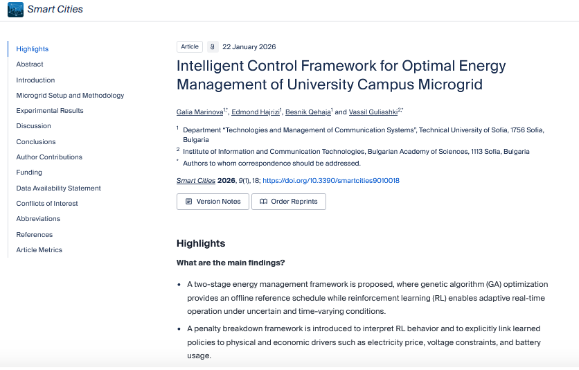 Në bashkautorësi me Rektorin e UBT-së, Prof. Dr. Edmond Hajrizi, Prof. Dr. Galia Marinova, Dr. Besnik Qehaja dhe Dr. Vassil Guliashki, është publikuar artikulli shkencor me titull: “Intelligent Control Framework for Optimal Energy Management of University Campus Microgrid”.