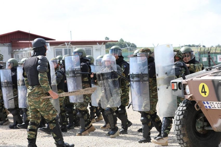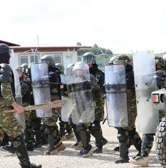 “Ushtarët grekë nga Batalioni i 2-të i Forcave Rezervë Operacionale Shumëkombëshe kryen një stërvitje stërvitore për Kontrollin e Trazirave të Turmave dhe Heqjen e Pengesave në kampin Novosellë.
