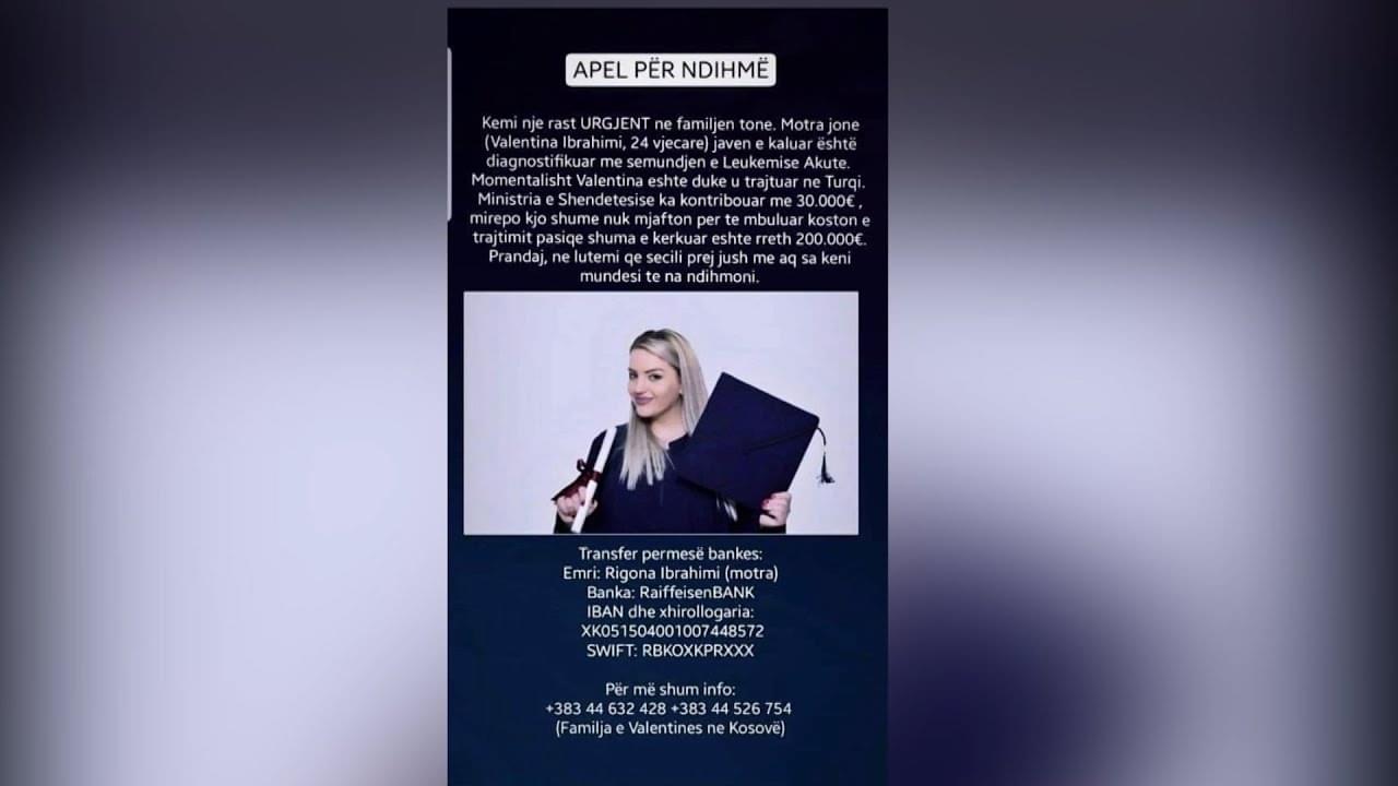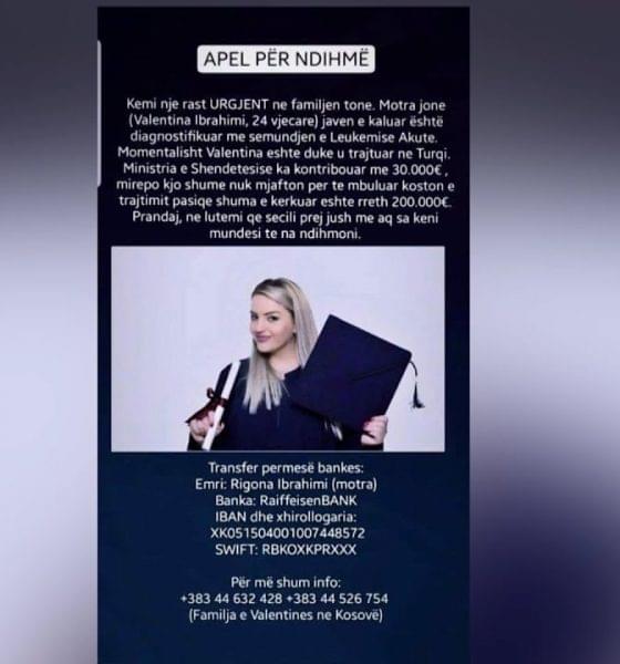 Betim GashiKa vdekur Valentina Ibrahimi, 24-vjeçarja nga Ferizaj e cila ishte diagnostifikuar me leukemi akute. Ibrahimi nuk mundi t’i bëjë ballë sëmundjes dhe vdiq në Turqi.