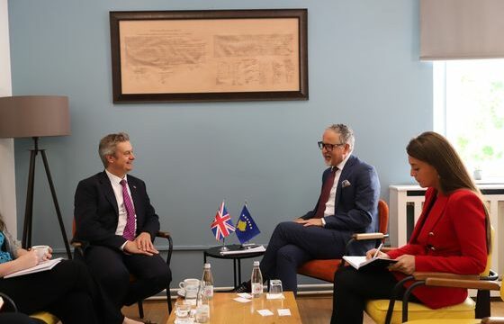 Ambasadori Hargreaves në këtë takim ishte i shoqëruar nga Zyrtari për Politika Ekonomike dhe Tregtare në Ambasadën Britanike në Kosovë, Blond Gerqari.